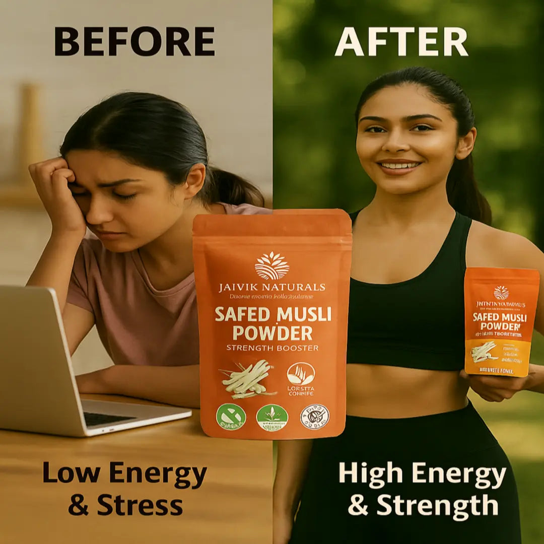 Traditionally known as a natural energy booster and a rejuvenator, Safed Musli is widely used to increase stamina, support muscle strength, and promote hormonal balance. Whether you are an athlete, fitness enthusiast, or someone seeking to revitalize your lifestyle, Jaivik Naturals Safed Musli Powder is your trusted companion for sustained energy and well-being.