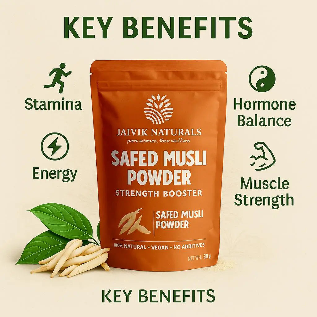 Boost your strength and stamina naturally with Jaivik Naturals Safed Musli supplement Powder, a powerful herbal supplement revered Sourced from the finest Chlorophytum Borivilianum roots (Safed Musli), this 100% pure and natural powder is rich in alkaloids, proteins, and essential nutrients that help enhance vitality, improve physical performance, and support overall wellness.